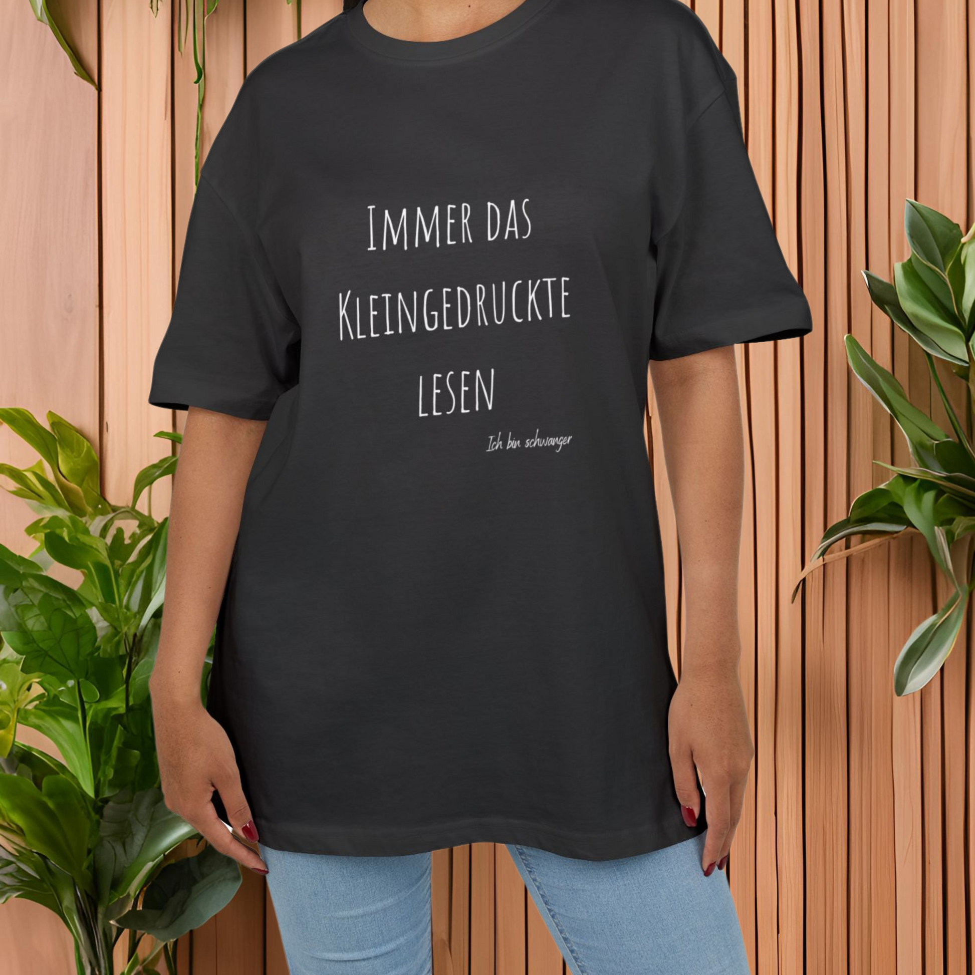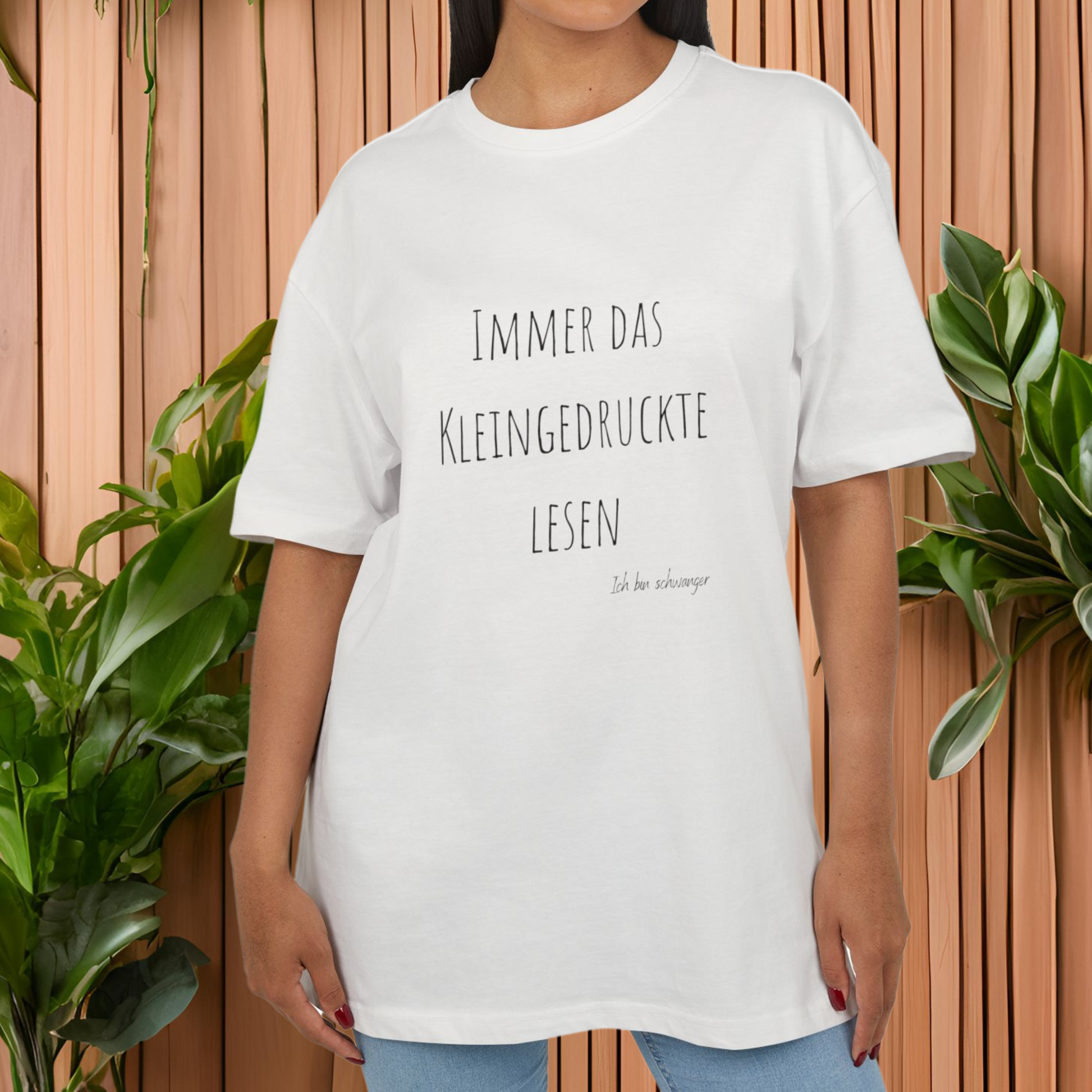 Oversized T-Shirt zur Schwangerschaftsverkündung Kleingedrucktes lesen
